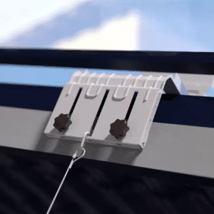 Voor plaatsing bij een dakraam kan de beugel met de bijgeleverde onderdelen worden aangepast en stevig aan het raam- of kozijnprofiel worden bevestigd. Vervolgens wordt de buitenunit in de beugel geschoven en goed vastgezet, zodat deze stevig hangt en netjes op zijn plek blijft.